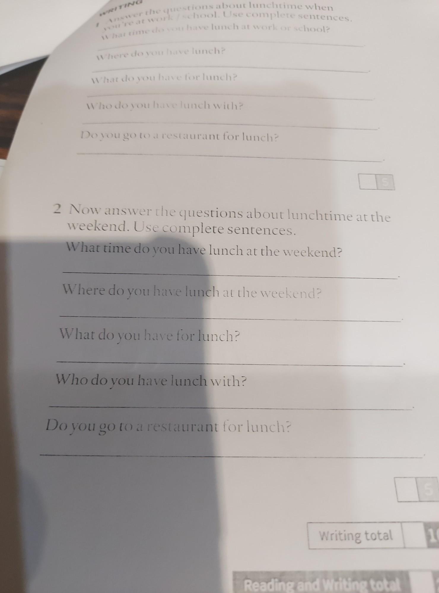 2 Now answer the questions about lunchtime at the weekend. Use complete sentences. What time do you have lunch at the weekend? Where do you have lunch at the weekend? What do you have for lunch? Who do you have lunch with? Do you go to a restaurant for lunch?