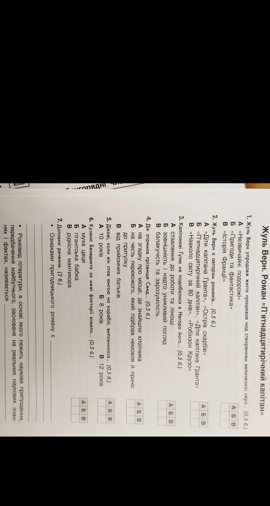 6 клас Частина Прізвище, ім'я 3 ЗАРУБІЖНА ЛІТЕРАТУРА -Контрольна робота 2 (за програмою 2 год/тижд.)- Жуль Верн. Роман «П'ятнадцятирічний капітан» 1. Жуль Верн упродовж життя працював над створенням величезної серії... (0,5 б.) А «Незвичайні подорож А Б В Б «Пригоди та фантастика>> в «Історія Франції» 2. Жуль Верн є автором романів... (0,5 б.) А «Діти капітана Гранта», «Острів скарбів>> Б «П'ятнадцятирічний капітан», «Діти капітана Гранта>> В «Навколо світу за 80 днів», «Робінзон Крузо» Дата 3. Капітанові Ґулю не подобалися в Негоро його... (0,5 б.) А ставлення до роботи та лінощі Б зовнішність і надто уникливий погляд В балакучість та зарозумілість 4. Дік отримав прізвище Сенд... (0,5 б.) А на згадку про місце, де знайшли хлопчика Б на честь перехожого, який підібрав немовля й приніс до притулку в від прийомних батьків 5. Дікові, коли він став юнгою на кораблі, виповнилося... (0,5 6.) А 10 РОКІВ Б 8 РОКІВ в 12 років 6. Кузена Бенедикта за межі факторiï вивела... (0,5 б.) А муха цеце Б гігантська бабка в рідкісна мантикора 7. Доповни речення. (2 б.) • ● Ознаками пригодницького роману е Варіант 1 А Б B А Б В A А Б В А Б B Різновид літератури, в основі якого лежить наукове припущення, передбачення майбутнього, засноване на реальних наукових знан- нях і фактах, називається