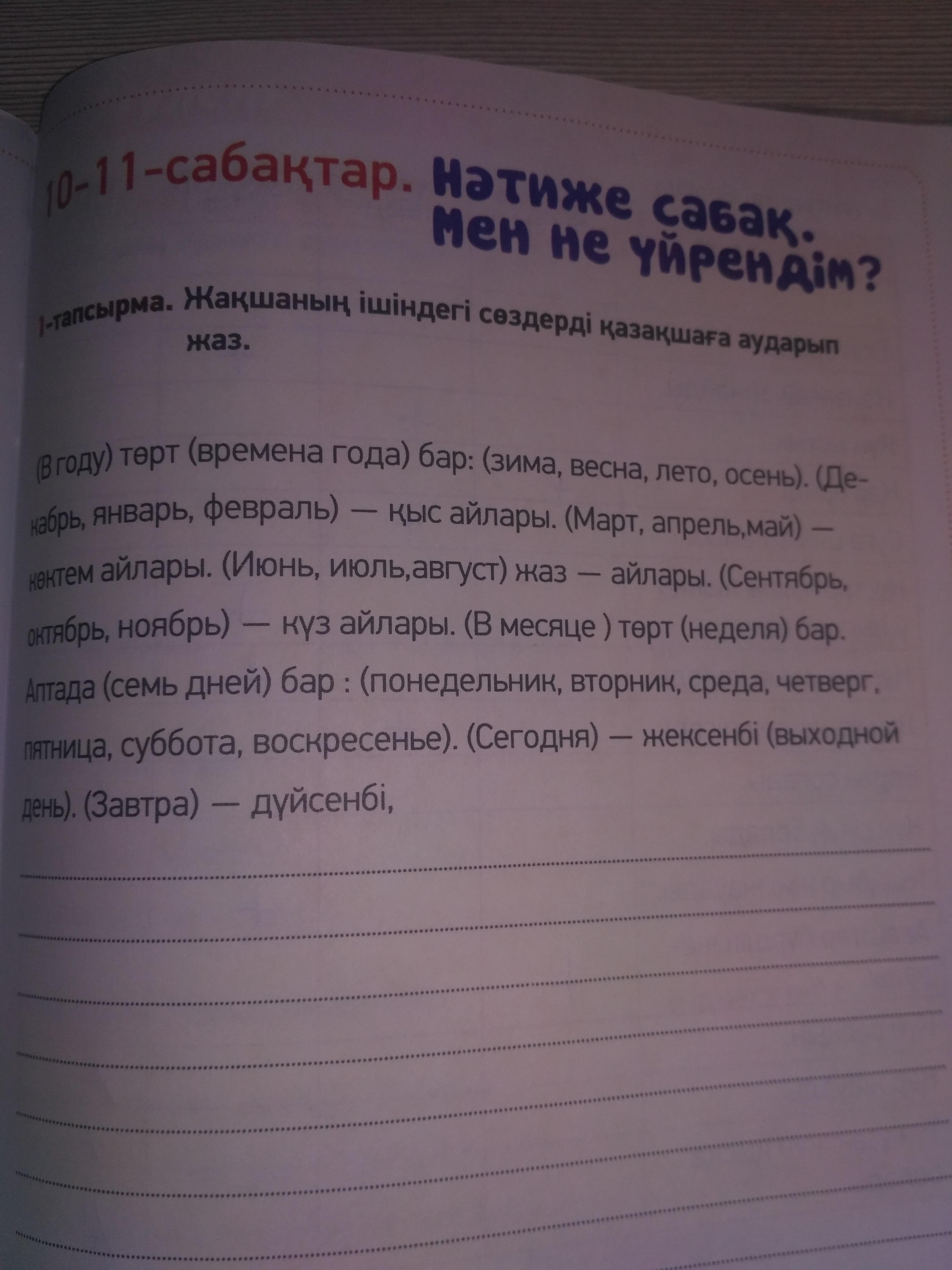 (жылда) төрт (мезгіл)бар:(қыс,көктем,жаз,күз).(желтоқсан,қаңтар,ақпан)-қыс айлары.(наурыз,сәуір,мамыр)-көктем айлары.(маусым,шілде,тамыз)-жаз айлары.(қыркүйек,қазан,қараша)-күз айлары.(бір айда)төрт (апта)бар.Аптада(жеті күн)бар(дүйсенбі,сейсенбі,сәрсенбі,бейсенбі,жұма,сенбі,жексенбі).(бүгін)-жексенбі(демалыс күн).(Ертең)-дүйсенбі