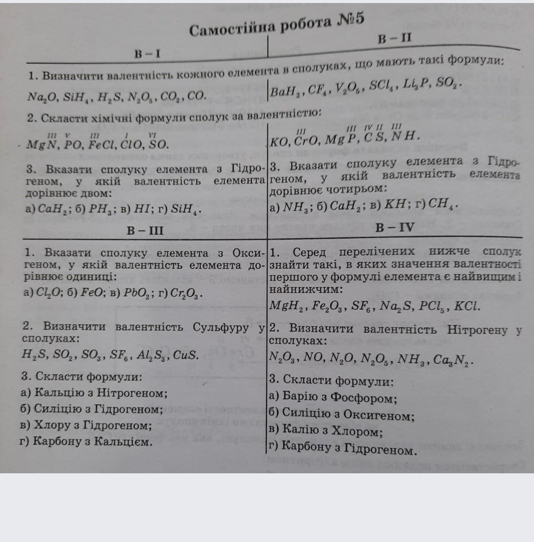 2. S - II, S - IV, S - VI, S - VI, S - II, S - II (Cu має ще валентність І, але оскільки к-сть атомів в молекулі рівна, значить і валентність рівна, а S не може бути I, тільки II, IV, VI, VIII)