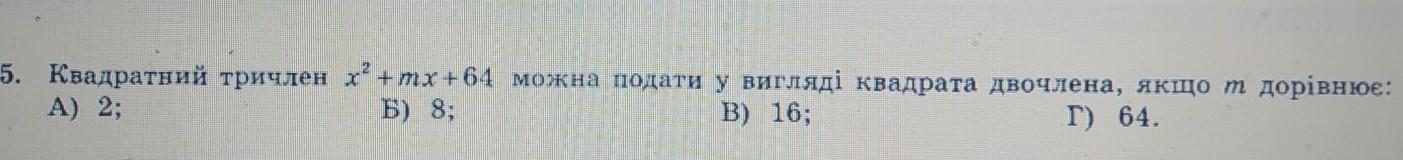 Квадратний тричлен х2 + mx+64 можна подати у вигляді квадрата двочлена, якщо м дорівнюе: