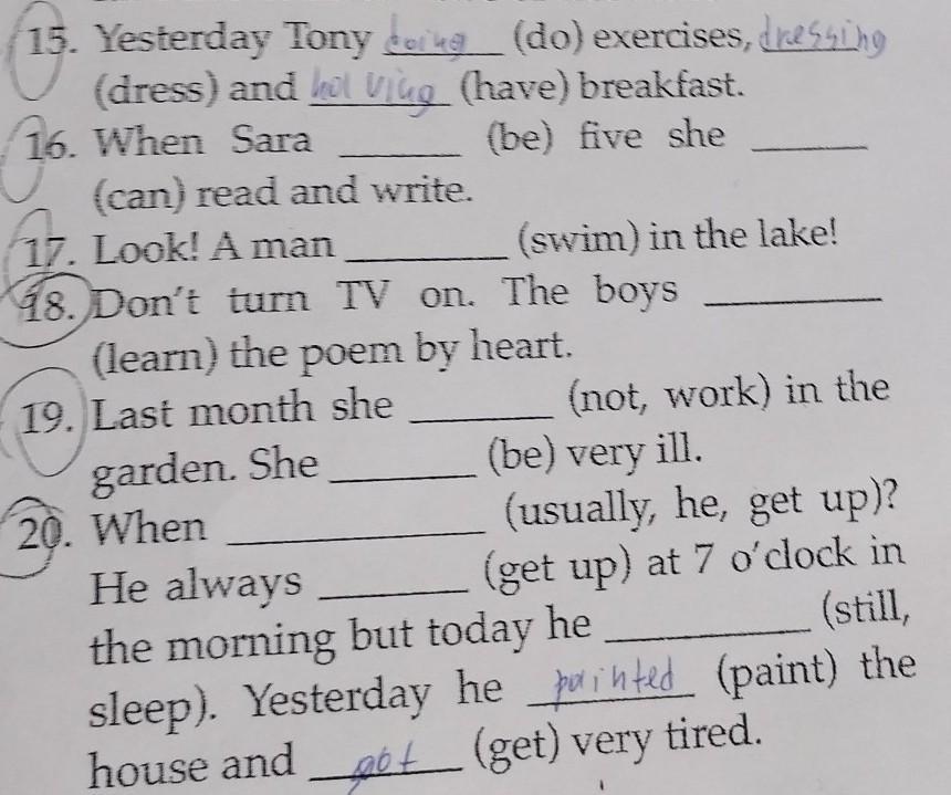 6. Usually he gets up. Gets up. Is still sleeping. Painted. Got.
