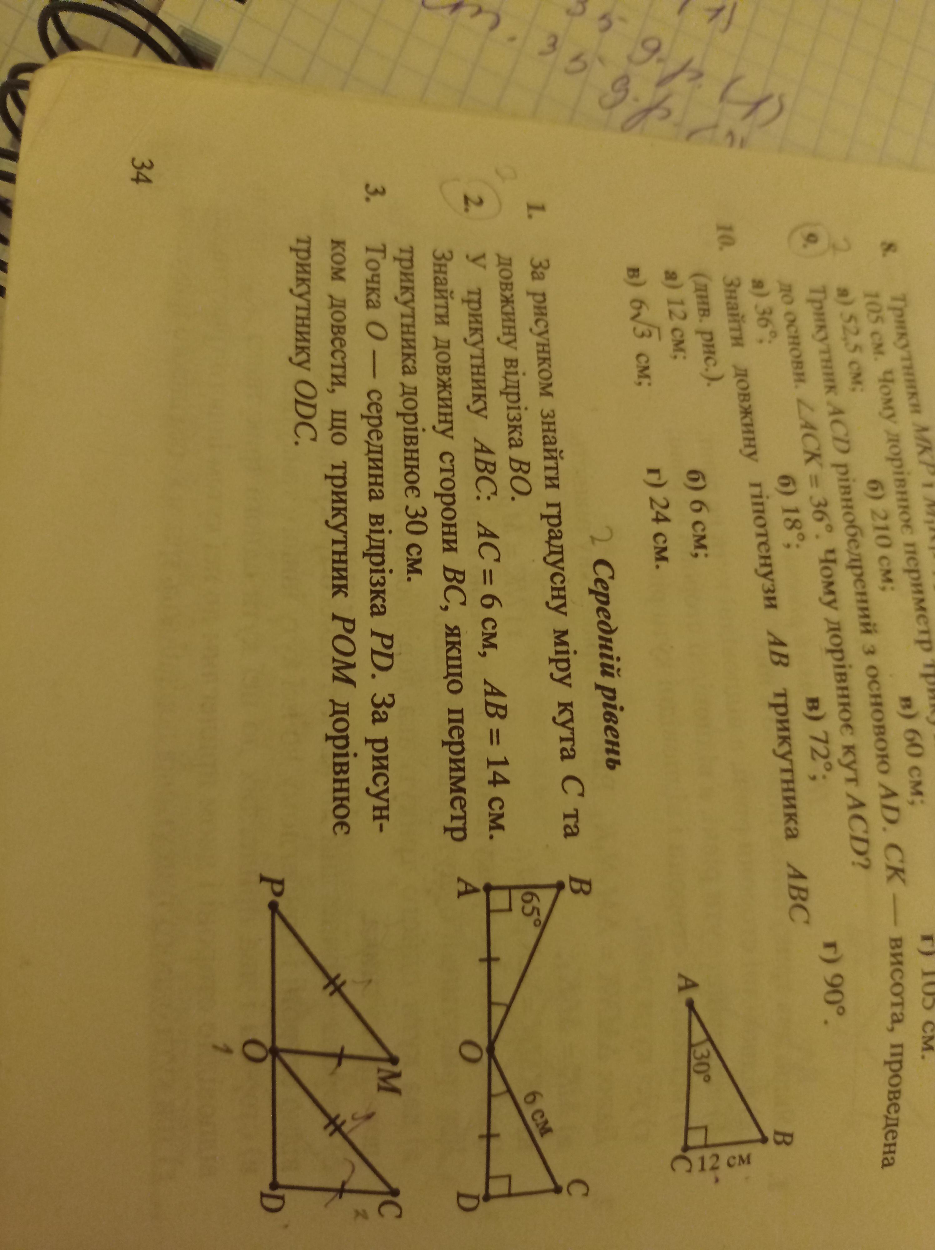 отже трикутник ВОА= трикутнику СОД за стороною та 2 прилеглими кутами. ВО=ОС=6 см і < С = < В=65° (як відповідні елементи рівних трикутників)