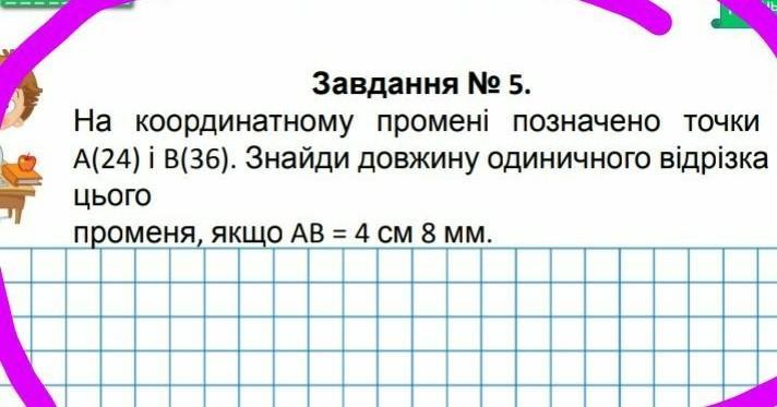 Завдання № 5. На координатному промені позначено тОЧКИ A(24) i B(36). Знайди довжину одиничного відрізка ЦЬОГО променя, якщо АВ = 4 см 8 мм.