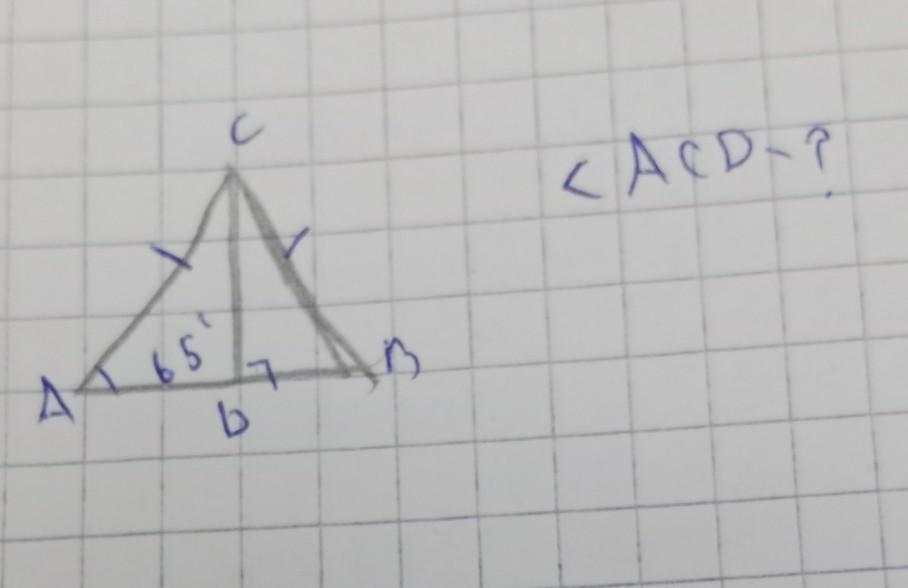 Так як на малюнку це рівнобедрений трикутник то кут CAB=CBA=65° За теоремою ми знаємо сума всіх сторін трикутника дорівнює 180°отже ACD=180-(65+65)=50°
