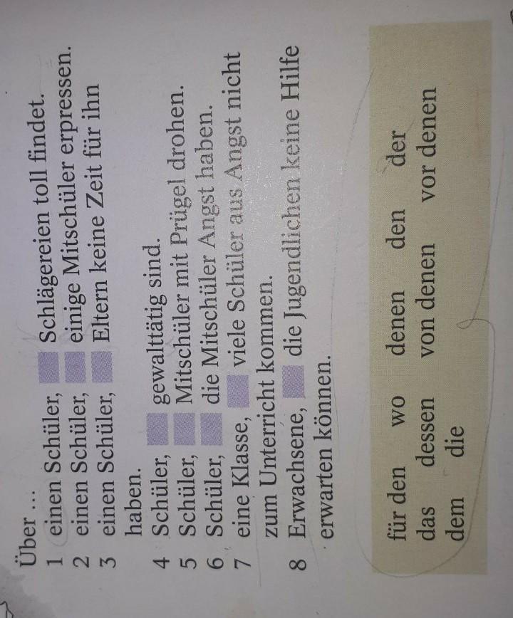 7. wo (я бы здесь использовал deren, но его нет в задании - класс, ученики которого из-за страха не приходят на уроки)
