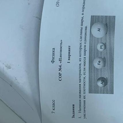 1. Напиши названия материалов, из которых сделаны шары, в порядке