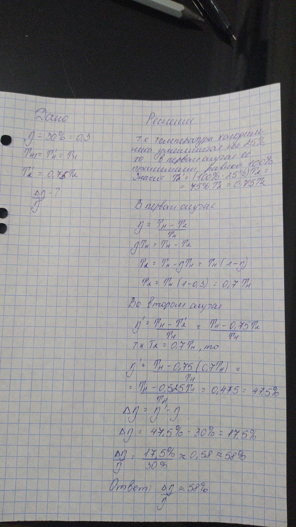 7. Термический коэффициент полезного действия идеального теплового двигателя 30 %. Определите, на сколько увеличится термический коэффициент полезного действия, если, не меняя температуру нагревателя, абсолютную температуру холодильника уменьшить на 25%.
