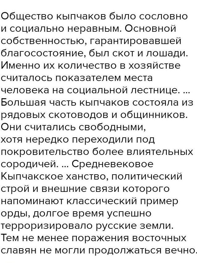 Общество кыпчаков было сословно и социально неравным. Основной собственностью, гарантировавшей благосостояние, был скот и лошади. Именно их количество в хозяйстве считалось показателем места человека на социальной лестнице. ... Большая часть кыпчаков состояла из рядовых скотоводов и общинников. Они считались свободными, хотя нередко переходили под покровительство более влиятельных сородичей. ... Средневековое Кыпчакское ханство, политический строй и внешние связи которого напоминают классический пример орды, долгое время успешно терроризировало русские земли. Тем не менее поражения восточных славян не могли продолжаться вечно.