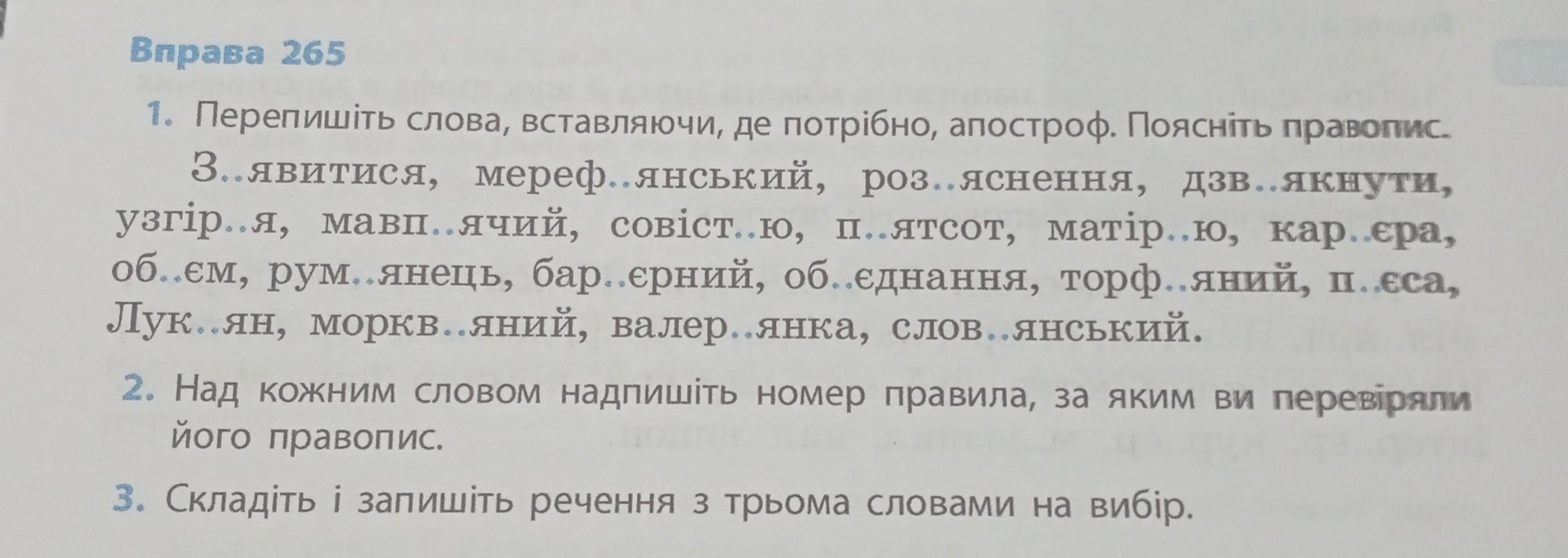 З'явитися, мереф'янський, роз'яснення, дзвякнути, узгір'я, мавпячий, совістю, п'ятсот, матір'ю, кар'єра, об'єм, рум'янець, бар'єрний, об'єднання, торф'яний, п'єса, Лук'ян, морквяний, валерьянка, слов'янський.
