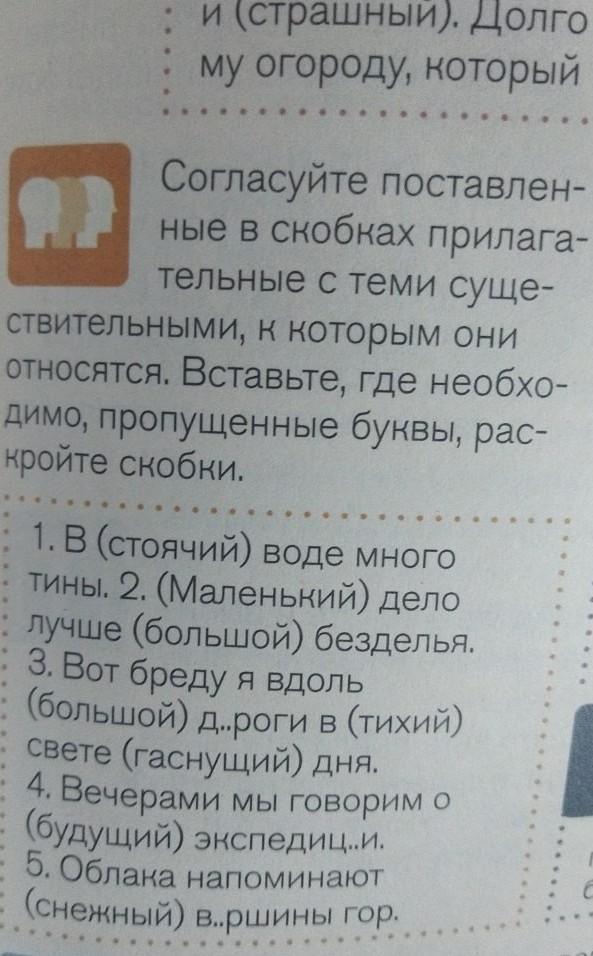 Согласуйте поставленные в скобках прилагательные с теми существительными, к которым они относятся. Вставьте, где необходимо, пропущенные буквы, рас- кройте скобки. 1. В (стоячий) воде много тины. 2. (Маленький) дело лучше (большой) безделья. 3. Вот бреду я вдоль (большой) д..роги в (тихий) свете (гаснущий) дня. 4. Вечерами мы говорим о (будущий) экспедиц..и. 5. Облака напоминают (снежный) в..ршины гор.