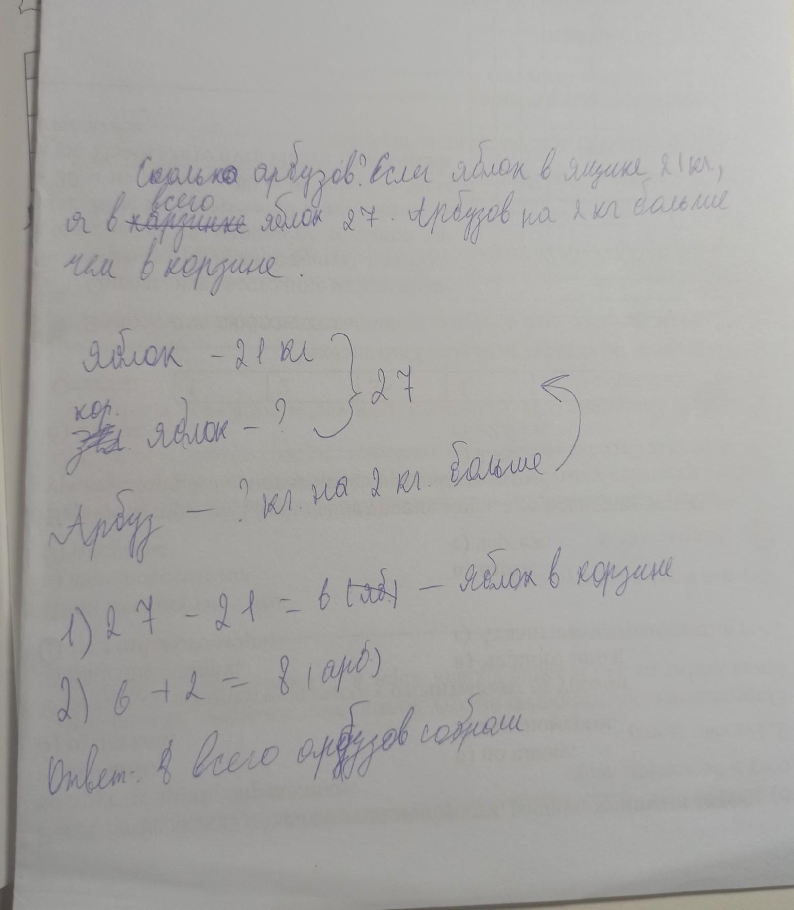 В магазин привезли 27 кг мандаринов и яблок. Известно, что мандаринов 21 кг. Сколько кг арбузов привезли,если их на два кг больше, чем яблок?