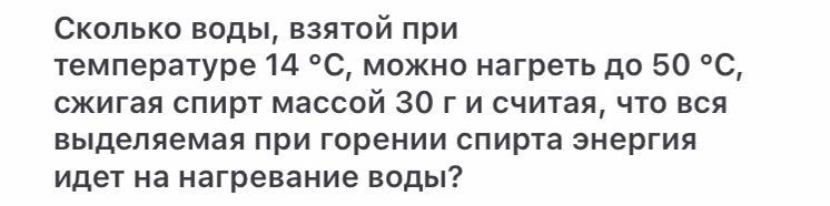 Сколько воды, взятой при температуре 14 градусов, можно нагреть до 50 градусов, сжигая спирт массой 30 г и считая, что вся выделяемая при горении спирта энергия идет на нагревание воды?