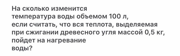 ЗАДАНИЕ: на сколько изменится температура воды объемом 100 л, если считать, что вся теплота, выделяемая при сжигании древесного угля массой 0,5кг, пойдет на нагревание воды?