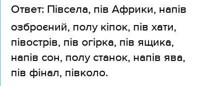 Задача: 7. Розкрий дужки: (пів) книги, (пів) Америки, (напiв) озброений, (полу) кіпок, (пів) машини, (пів) піци, (пів) огірка, (пів) ящірки, (пів) яблука, (пів) заводу, (полу) станок, (напів) ява, (пів) фінал, (пів) міста, (пів) Вінниці, (пів) яру, (пів) юрти, (пів) їдальні, (нажав) ява, (пів) Юрмали, (пів) Єгипта.