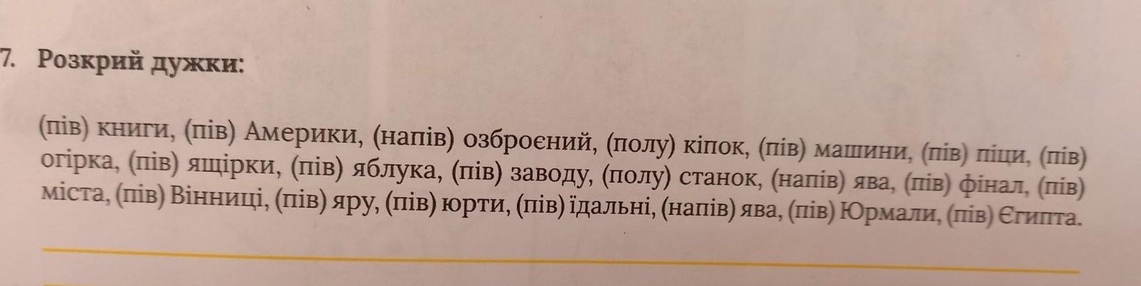 7. Розкрий дужки: (пів) книги, (пів) Америки, (напiв) озброений, (полу) кіпок, (пів) машини, (пів) піци, (пів) огірка, (пів) ящірки, (пів) яблука, (пів) заводу, (полу) станок, (напів) ява, (пів) фінал, (пів) міста, (пів) Вінниці, (пів) яру, (пів) юрти, (пів) їдальні, (нажав) ява, (пів) Юрмали, (пів) Єгипта.
