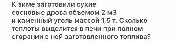 К зиме заготовили сухие сосновые дрова объемом 2 м3 и каменный уголь массой 1,5 т. Сколько теплоты выделиться в печи при полном сгорании в ней заготовленного топлива?
