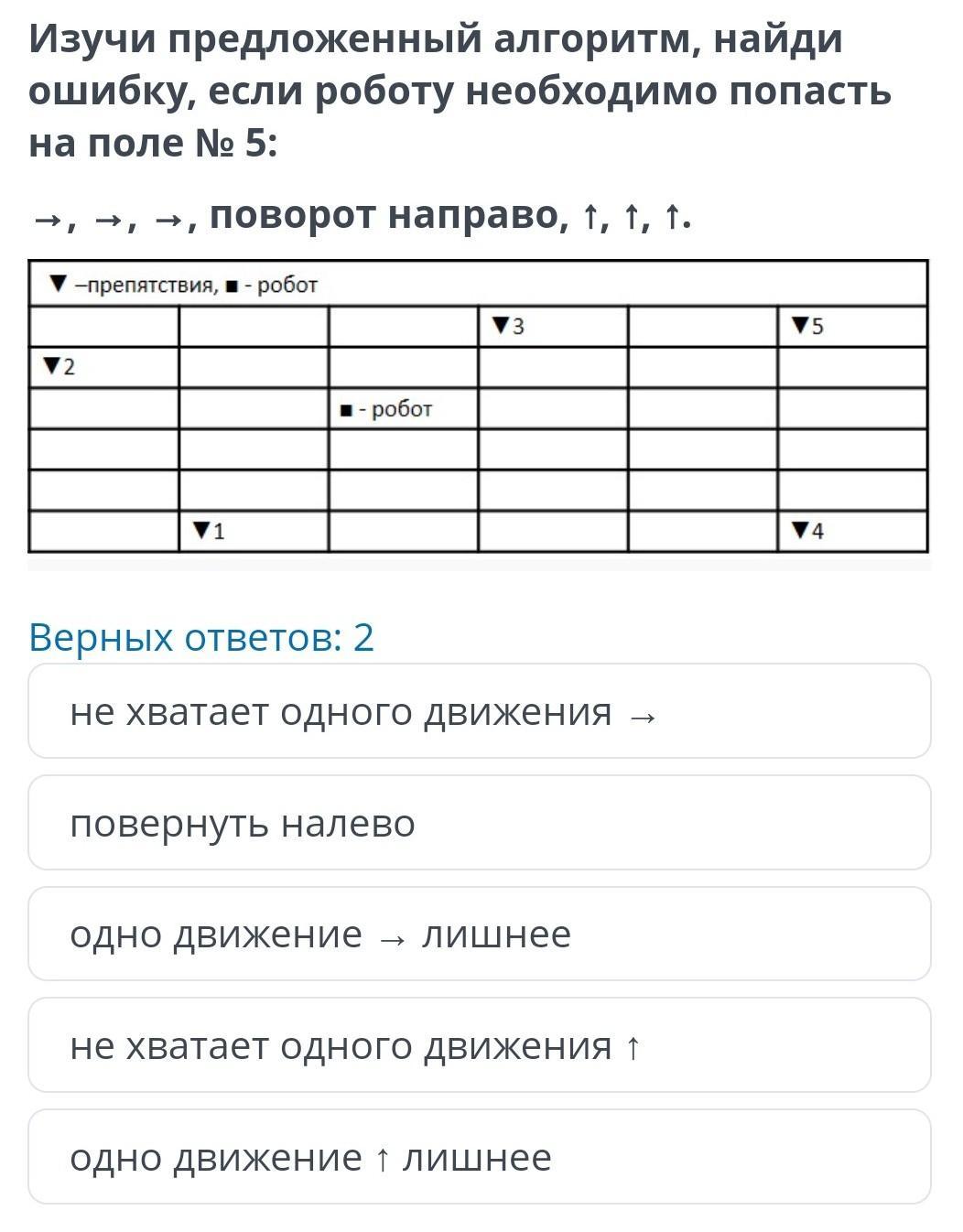 Изучи предложенный алгоритм, найди ошибку, если роботу необходимо попасть на поле № 5: →, →, →, Поворот направо, t, t, t. -препятствия, робот ▼2 1 ■ - робот ▼3 Верных ответов: 2 не хватает одного движения повернуть налево одно движение → лишнее не хватает одного движения ↑ одно движение ↑ лишнее ▼5 ▼4