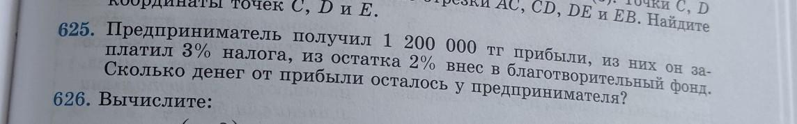 625. Предприниматель получил 1 200 000 тг прибыли, из них он за- платил 3% налога, из остатка 2% внес в благотворительный фонд. Сколько денег от прибыли осталось у предпринимателя? КАК РЕШИТЬ ПРИ ПОМОЩИ ПРОПОРЦИИ???? ДАМ 40 БАЛЛОВ