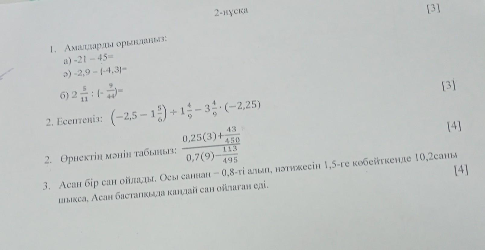 2-нуска [3] 1. Амалдарды орынданыз: a)-21-45= 3) -2,9 -(-4,3)= 6)21:(-2)- 2. Есептеңіз: (-2,5-15)+12-3, (-2,25) 0,25(3)+ 2. Өрнектің мәнін табыңыз: 43 N 450 113 495 0,7 (9) 3. Асан бiр сан ойлады. Осы саннан - 0,8-ті алып, нәтижесін 1,5-ге көбейткенде 10,2саны шыкса, Асан бастапқыда кандай сан ойлаган еді. [4 [3] [4]