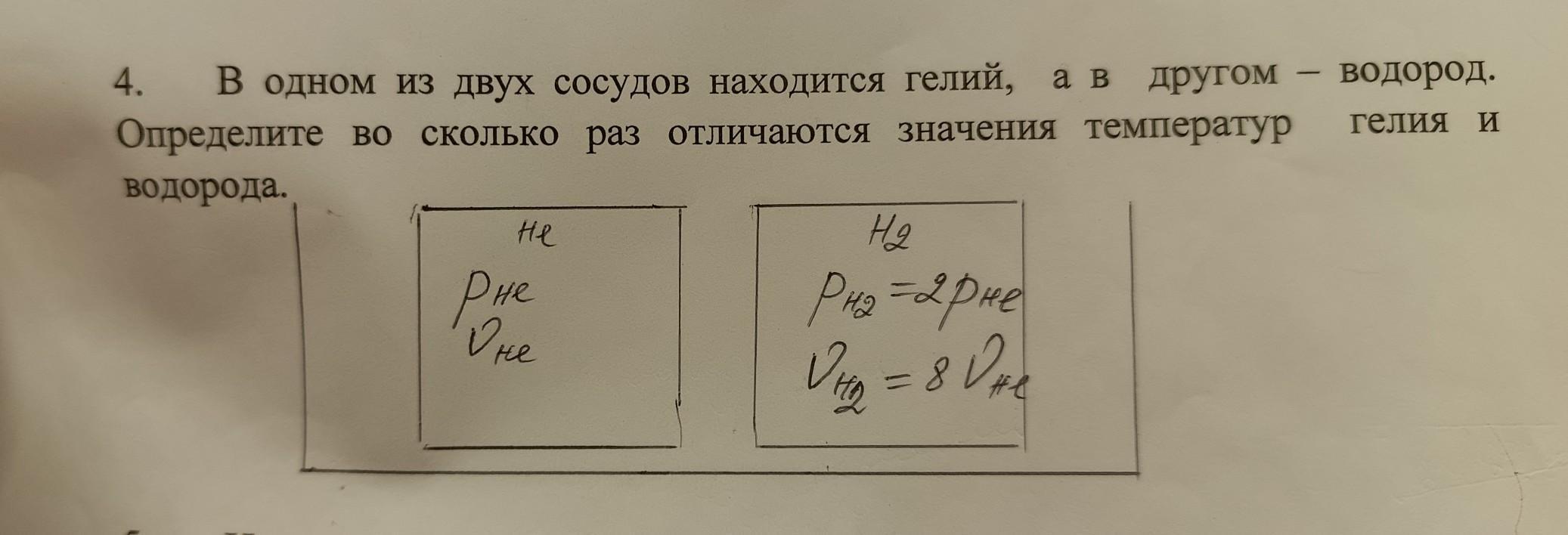 В одном из двух сосудов находится гелий, а в другом водород. Определите во сколько раз отличаются значения температур гелия и водорода.