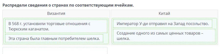 Распредели сведения о странах по соответствующим ячейкам. Византия Китай Император у-ди отправил на Запад ПОСОЛЬСТВО. В 568 г. установили торговые отношения с Тюркским каганатом. Создание одного из самых ценных товаров - шелка. Эта страна была главным потребителем шелка.