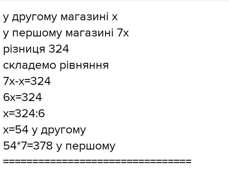 У першому магазині на 324 книжки бiльше, нiж у другому. Скільки книжок у кожному магазинi, якщо в першому їх у 7 разів більше, ніж у другому? Тільки з умовою