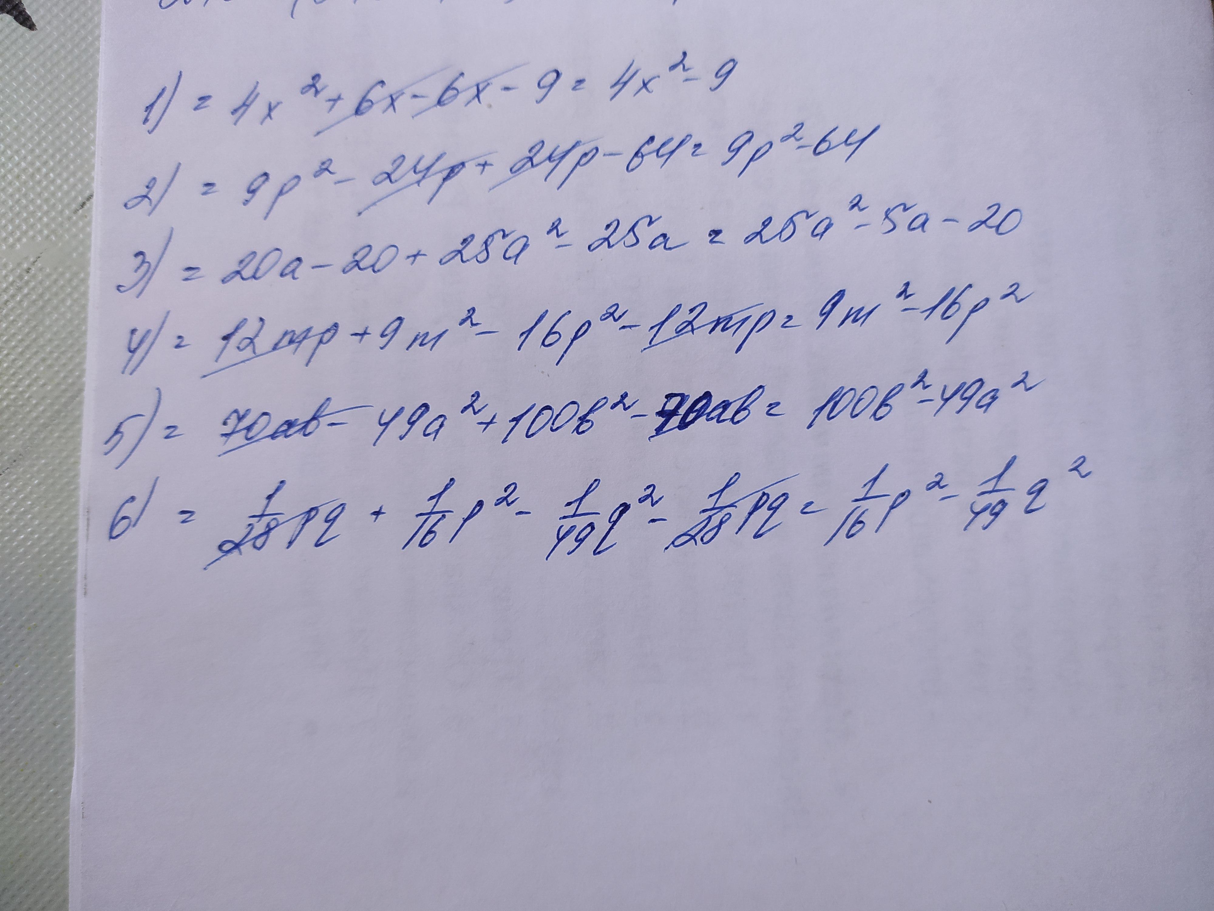 Подайте добуток у ввигляді многочлена: 1)(2x-3)(2x+3); 2) (3p+8)(3p-8); 3) (4+5a)(5a-5); 4) (3m-4p)(4p+3m); 5) (7a+ 10b)(10b-7a); 6) (1/4p-1/7q)(1/7q+1/4p)