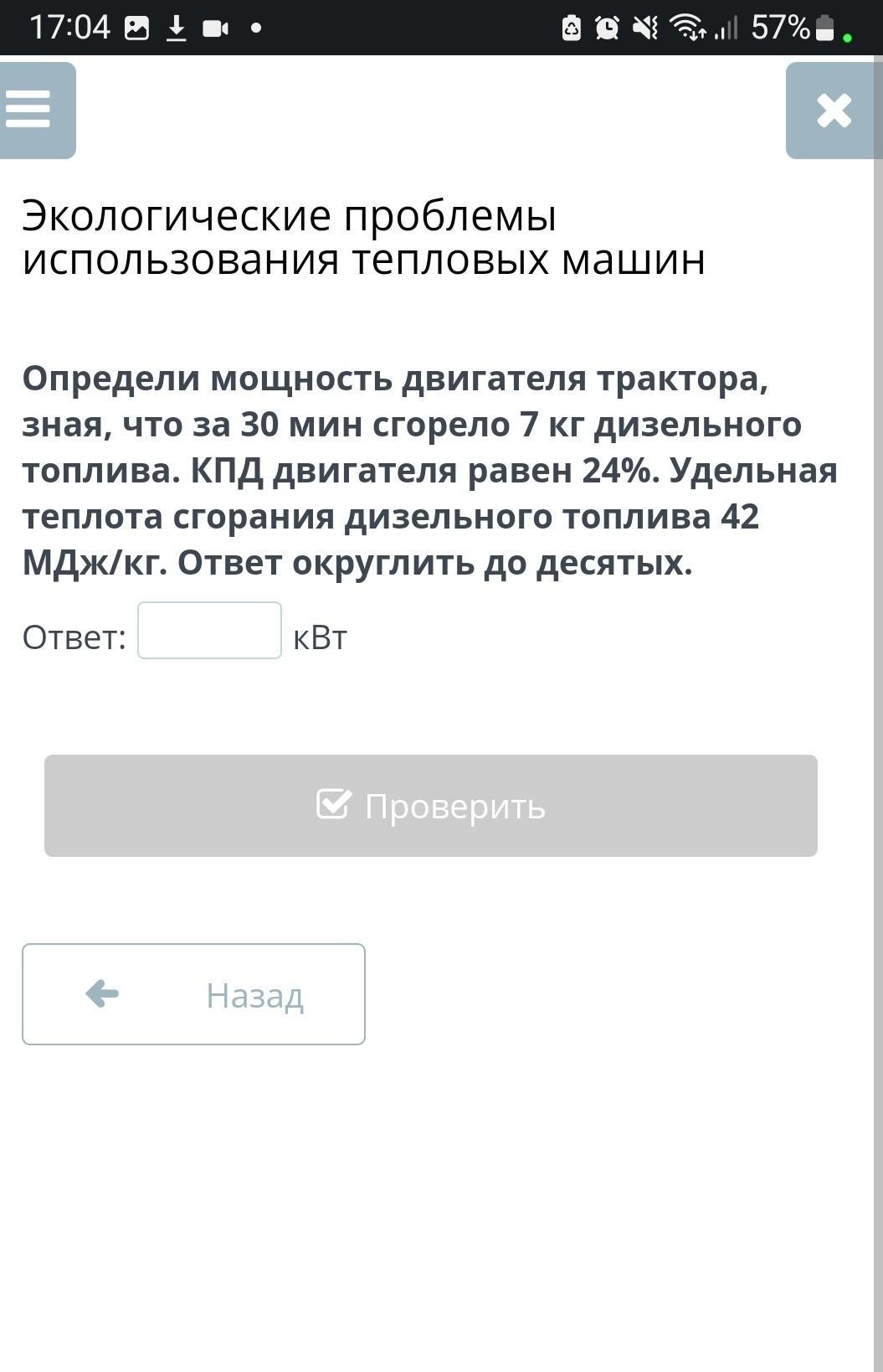 Определи мощность двигателя трактора, зная, что за 30 мин сгорело 7 кг дизельного топлива. КПД двигателя равен 24%. Удельная теплота сгорания дизельного топлива 42 МДж/кг. Ответ округлить до десятых.