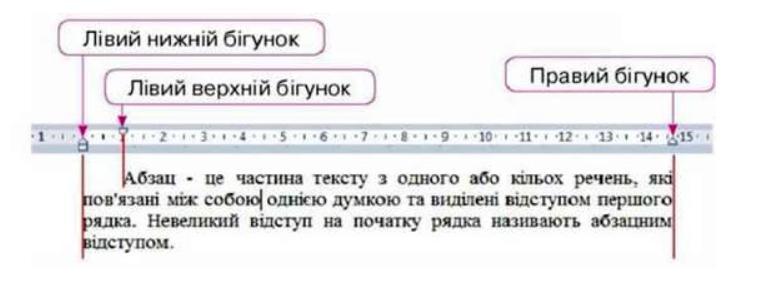 Розміщення абзацу на сторінці можна змінювати за допомогою бігунків на лінійці