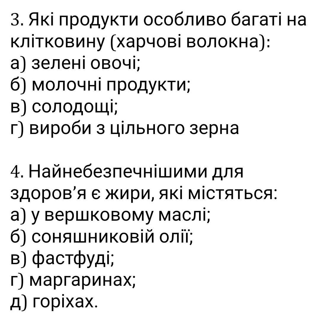 3. Які продукти особливо багаті на клітковину (харчові волокна): a) зелені овочі; б) молочні продукти; в) солодощі; г) вироби з цільного зерна