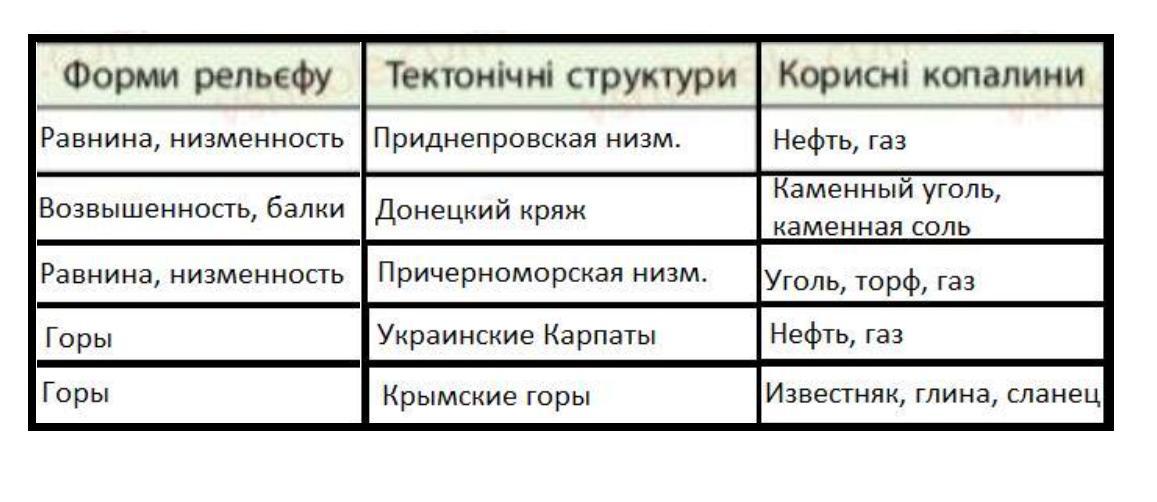- 1. Нижче зіставлена фізична, тектонічна і геологічна карти України та встановлена відповiднiсть між формами рельєфу, тектонічними структурами i геологічною будовою. Результати зіставлення записані у вигляді табл.
