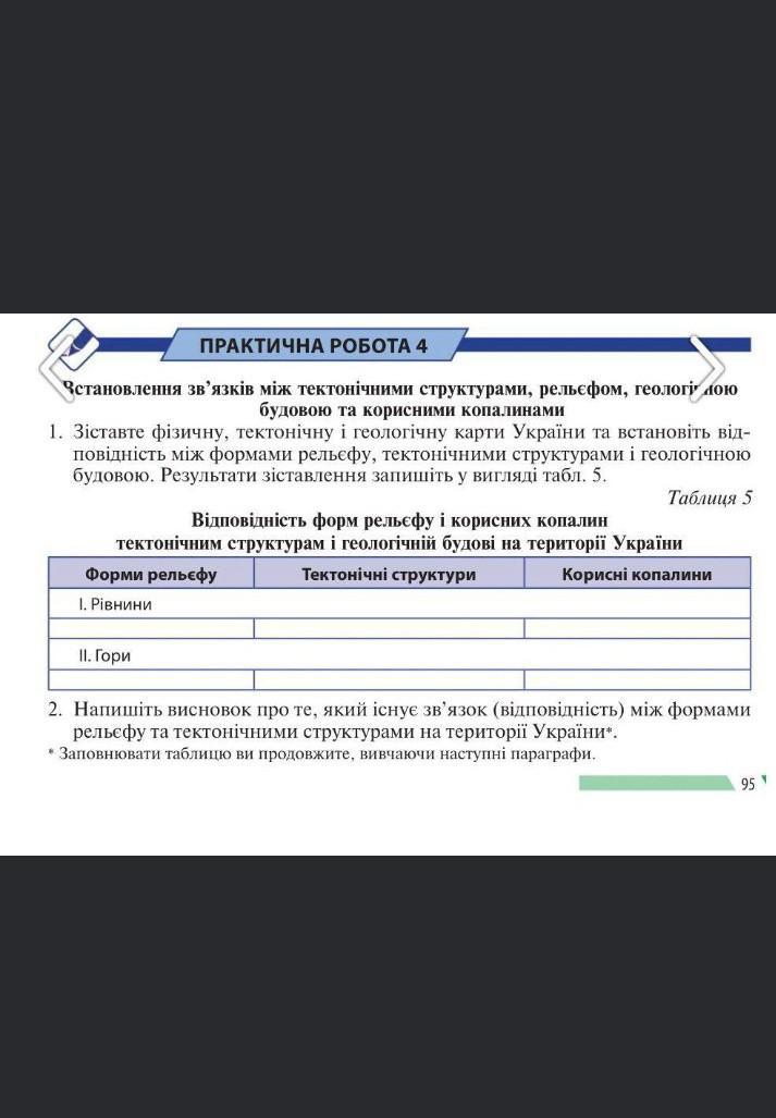 ПРАКТИЧНА РОБОТА 4 Встановлення зв'язкiв мiж тектонічними структурами, рельєфом, геологi ою будовою та корисними копалинами i 1. Зіставте фізичну, тектонічну і геологічну карти України та встановіть від- повiднiсть між формами рельєфу, тектонічними структурами i геологічною будовою. Результати зіставлення запишіть у вигляді табл. 5. Таблиця 5 Відповідність форм рельєфу і корисних копалин тектонічним структурам і геологiчнiй будові на території України Тектонічні структури форми рельефу Корисні копалини 1. Рівнини * II. Гори 2. Напишіть висновок про те, який існує зв'язок (вiдповiднiсть) між формами рельєфу та тектонічними структурами на території України*