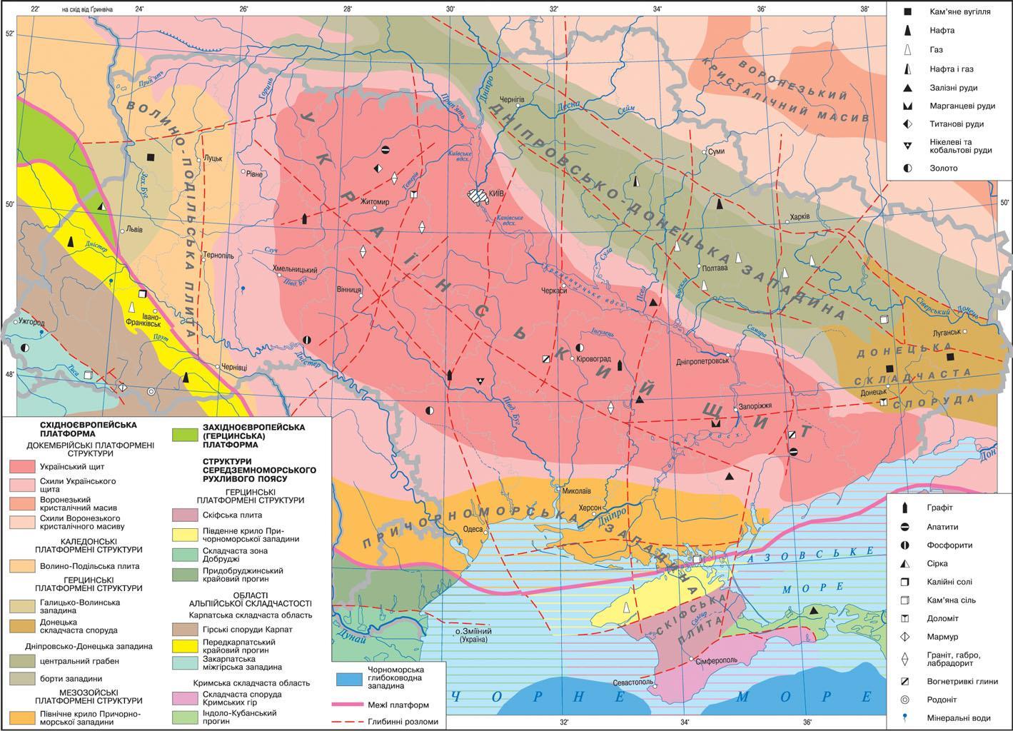 - 2. Напишіть висновок про те, який існує зв'язок (вiдповiднiсть) між формами рельєфу та тектонічними структурами на території України.Якщо ми подивимося на тектонічну карту України і фізичну карту з корисними копалинами, то можна зробити наступний висновок:складчастим областям, які розташовані на заході, сході і півдні країни притаманні гори і корисні копалини осадового походження, а платформним областям, які займають всю центральну частину країни притаманний рівнинний рельєф і корисні копалини осадового походження, рудні і нерудні.