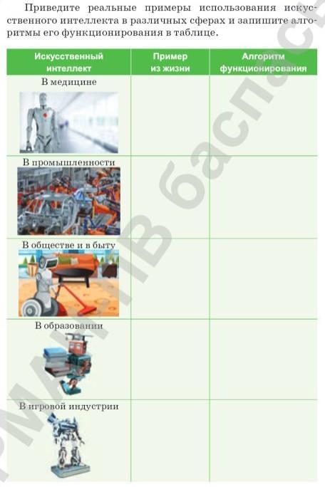 Приведите реальные примеры использования искусственного интеллекта в различных сферах и запишите алгоритмы его функционирования в таблице.