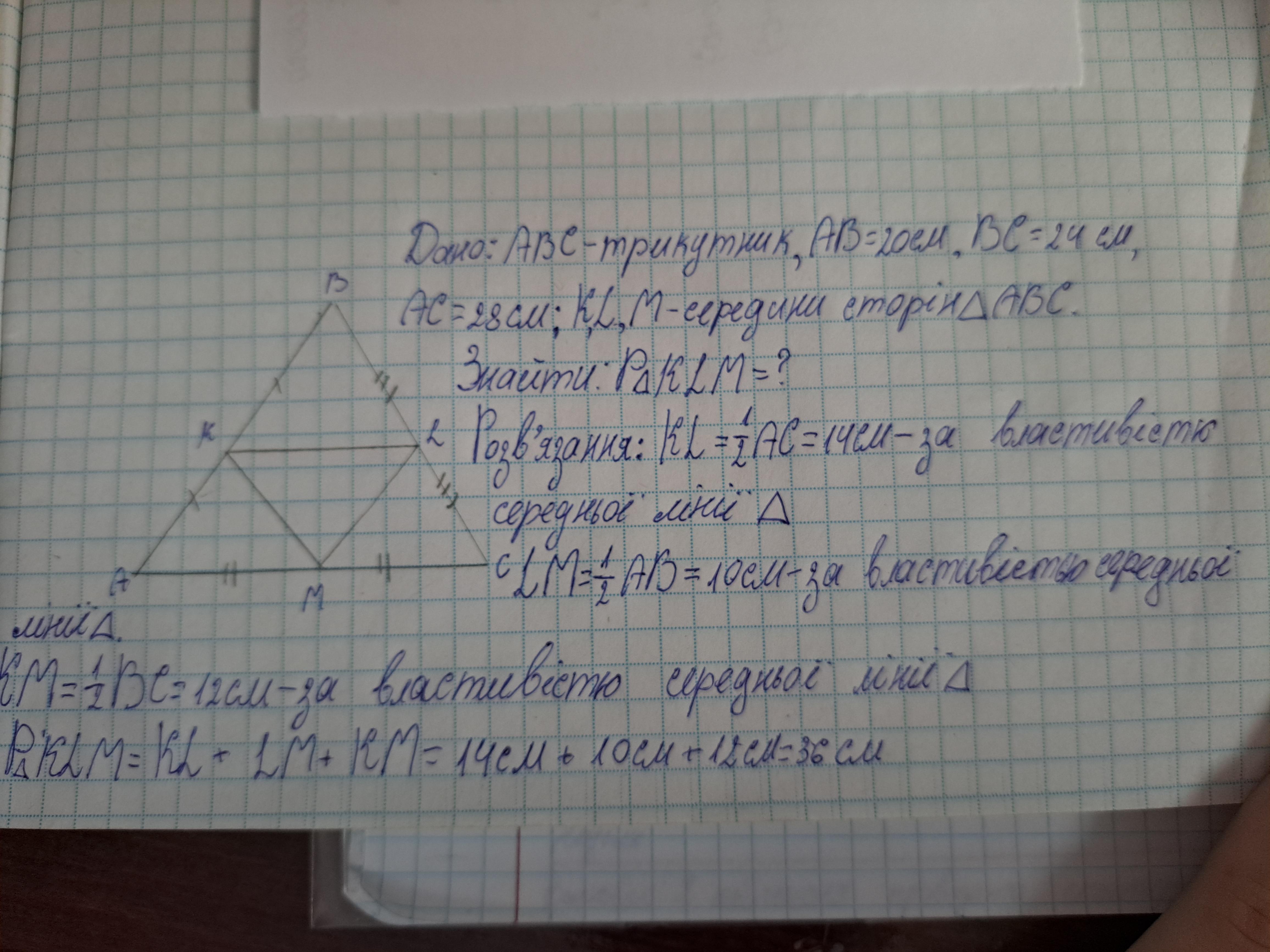 4. Сторони трикутника 20см, 24см, 28см.Знайти периметр трикутника, утвореного середніми лініями даного трикутника.