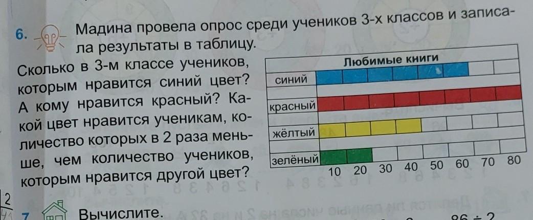 6. Мадина провела опрос среди учеников 3-х классов и записа- ла результаты в таблицу. ЯР Сколько в 3-м классе учеников, которым нравится синий цвет? А кому нравится красный? Ка- кой цвет нравится ученикам, ко- личество которых в 2 раза мень- ше, чем количество учеников, которым нравится другой цвет?