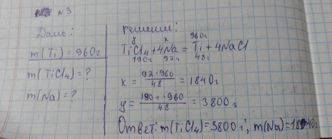для получения чистого титана используют восстановление TiCl4 натрием. сколько по массе TiCl4 и NA надо взять для получения 960 г титана? Ответ: 3800 г TiCl4 и 1840 г Na.