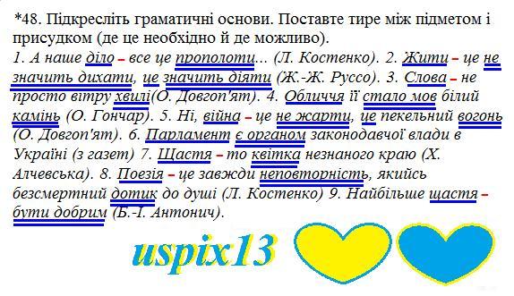 *48. Підкресліть граматичні основи. Поставте тире мiж підмет ком (де це необхідно й де можливо). 1. А наше діло все це прополоти... (Л. Костенко). 2. Жи чить дихати, це значить діяти (Ж.-Ж. Руссо). 3. Слова не I хвилі (О. Довгоп'ят). 4. Обличчя її стало в блий камінь 5. Ні, війна це не жарти, це пекельний вогонь (О. Довгоп ламент є органом законодавчої влади в Україні (з газет ТЯ то квітка незнаного краю (Х. Алчевська). 8. Поезія повторність, якийсь безсмертний дотик до душі (Л. 9. Найбільше щастя бути добрим (Б.-І. Антонич).