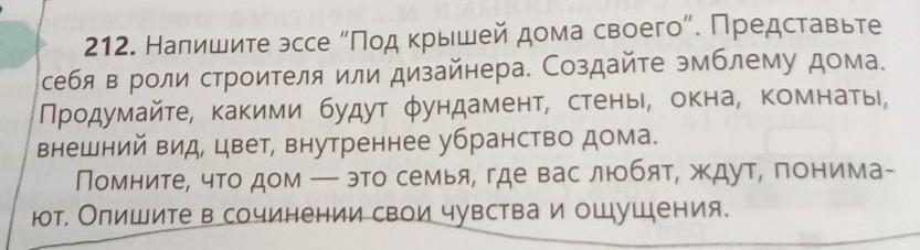 212. Напишите эссе "Под крышей дома своего". Представьте себя в роли строителя или дизайнера. Создайте эмблему дома. Продумайте, какими будут фундамент, стены, окна, комнаты, внешний вид, цвет, внутреннее убранство дома. Помните, что дом - это семья, где вас любят, ждут, понима- ют. Опишите в сочинении свои чувства и ощущения.ПАЖАЛУЙСТА МОЖНО ОБЪЕМНОЕ ЭССЕ НА 1 СТРАНИЦУ