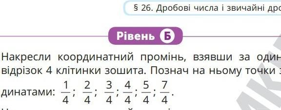 накрес ликоорднатний промені взявши за одиничні відрізок 4 клітинки зошита.позднач на ньому точку кординатноми . одна четверта частина.дві четверть . три чотири частини . чотири чотири частини. п'ять четверта. сім четверта частина