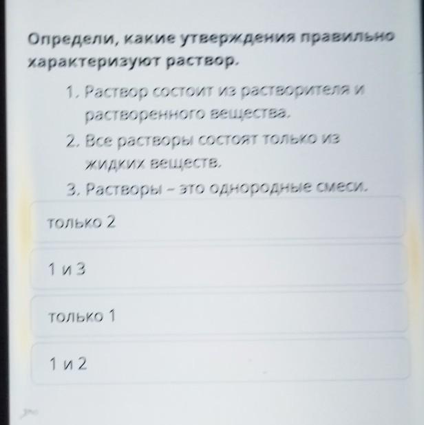 Определи, какие утверждения правильно характеризуют раствор. 1. Раствор состоит из растворителя и растворенного вещества. 2. Все растворы состоят только из жидких веществ. 3. Растворы - это однородные смеси. ТОЛЬКО 2 1 и 3 только 1 1 и 2 Проверить