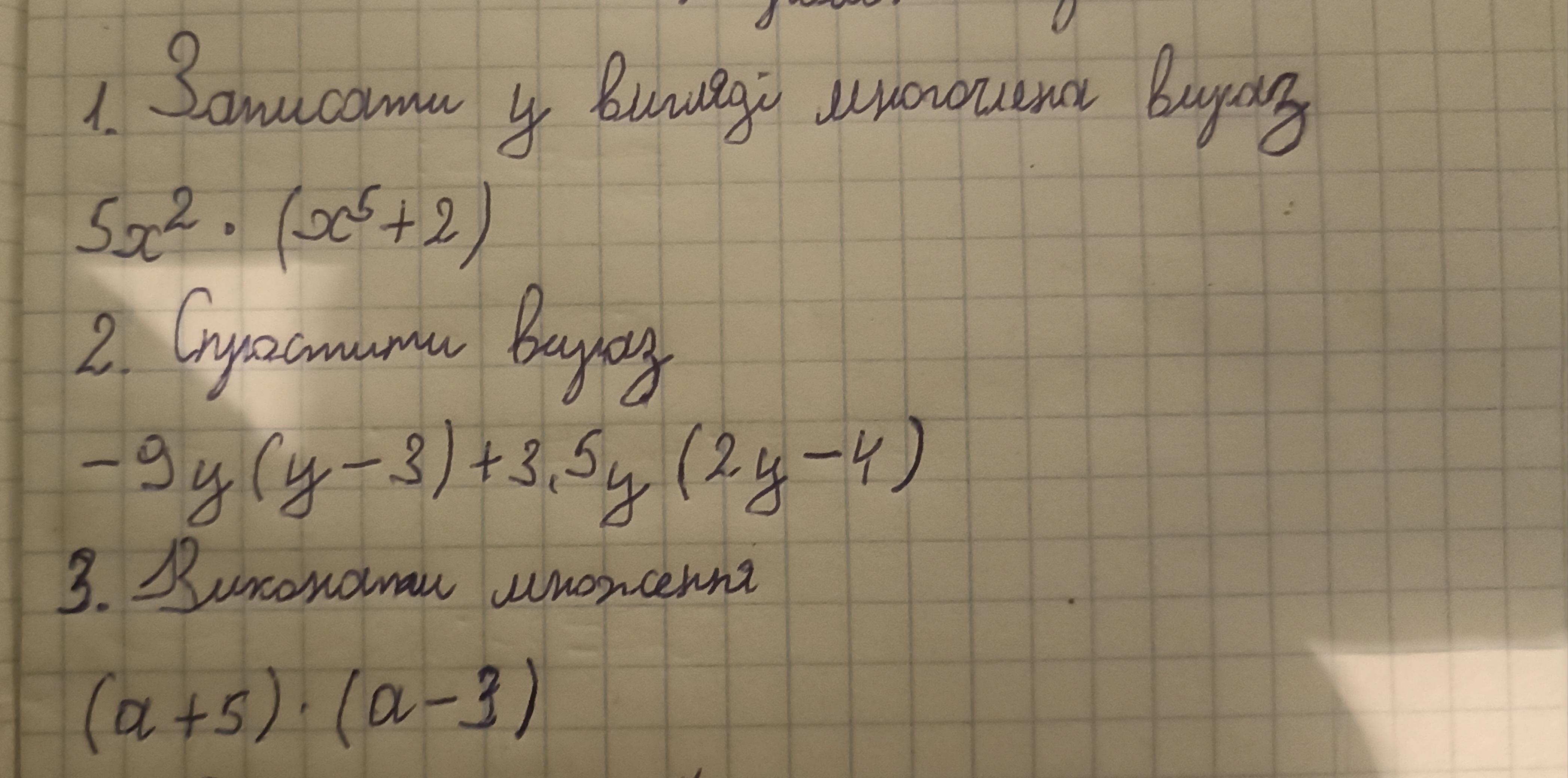 1. 5x в 7 степені 10x в 2 степені 2. -2y в 2 степені + 41y 3. a в 2 степені -3а +5а-15