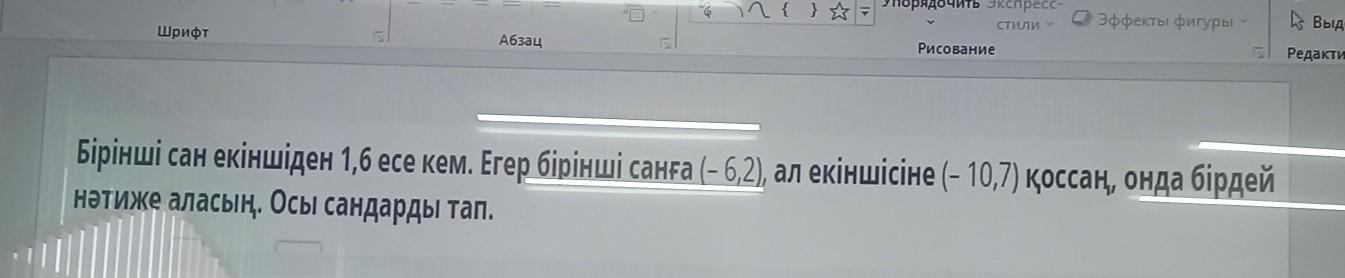 Бірінші сан екіншіден 1,6 есе кем. Егер бірінші санға (– 6,2), ал екіншісіне (– 10,7) қоссаң, онда бірдей нәтиже аласың. Осы сандарды тап. помогите