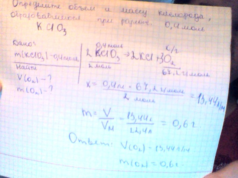 Определите Объем и массу кислорода,образовавшегося при разлож. 0,4 моль КClO3....