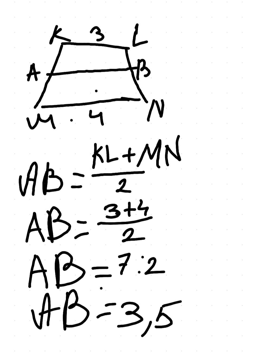Накресліть трапецію KLMN(KL//MN),KL =3 см,MN=4см.Знайдіть та позначте середню лінію.
