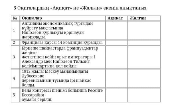 3 окигалардын «Ақиқат» не «Жалган» екенін анықтаңыз. № Оқигалар Ақиқат жалган 1 2 3 4 5 Англияны экономикалык тургыдан куйрету максатында Наполеон курлыкты коршауды жариялады. Францияга карсы 14 коалиция қурылды. Бiрнеше шайқастарда француздықтар жеңіске жеткеннен кейiн орыс императоры I Александр мен Наполеон Тильзит келісімшартына кол койды. 1812 жылы Мәскеу маңайындагы Дубосеково деревнясынын тусында iрi шайкас болды. Вена конгрессi шешiмi бойынша Ресейге Бессарабия аумагы берiлдi.пж 30 бал