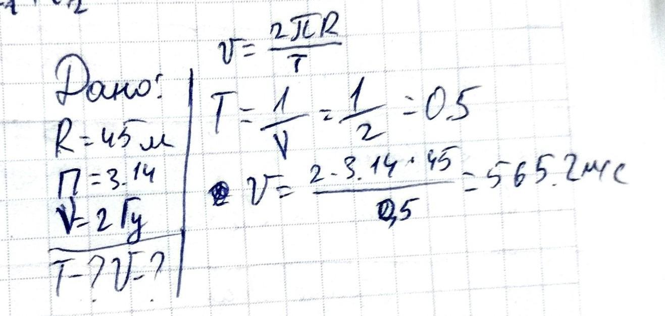 Знайдіть швидкість обертання колеса велосипеда радіусом 45м , якщо частота обертання колеса 2 оберти за секунд.