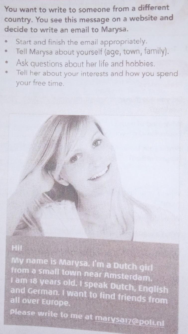 You want to write to someone from a different country. You see this message on a website and decide to write an email to Marysa. • Start and finish the email appropriately. Tell Marysa about yourself (age, town, family). Ask questions about her life and hobbies. Tell her about your interests and how you spend your free time.