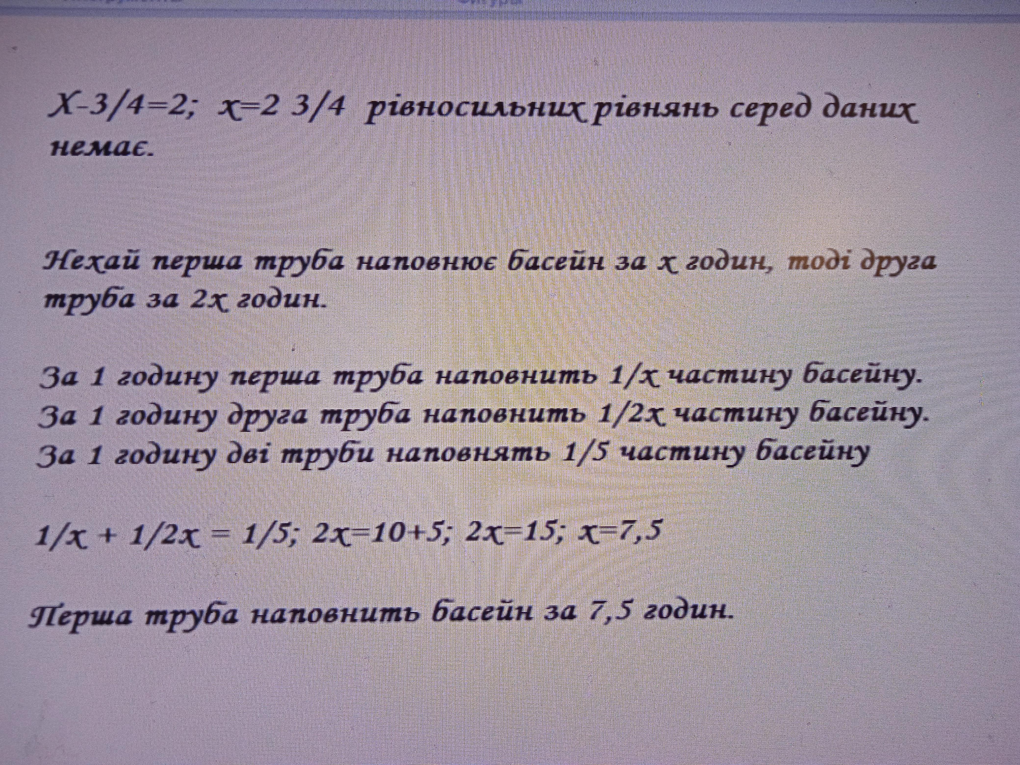 Заполняет весь бассейн 1 труба = (х) = 7,5 часов